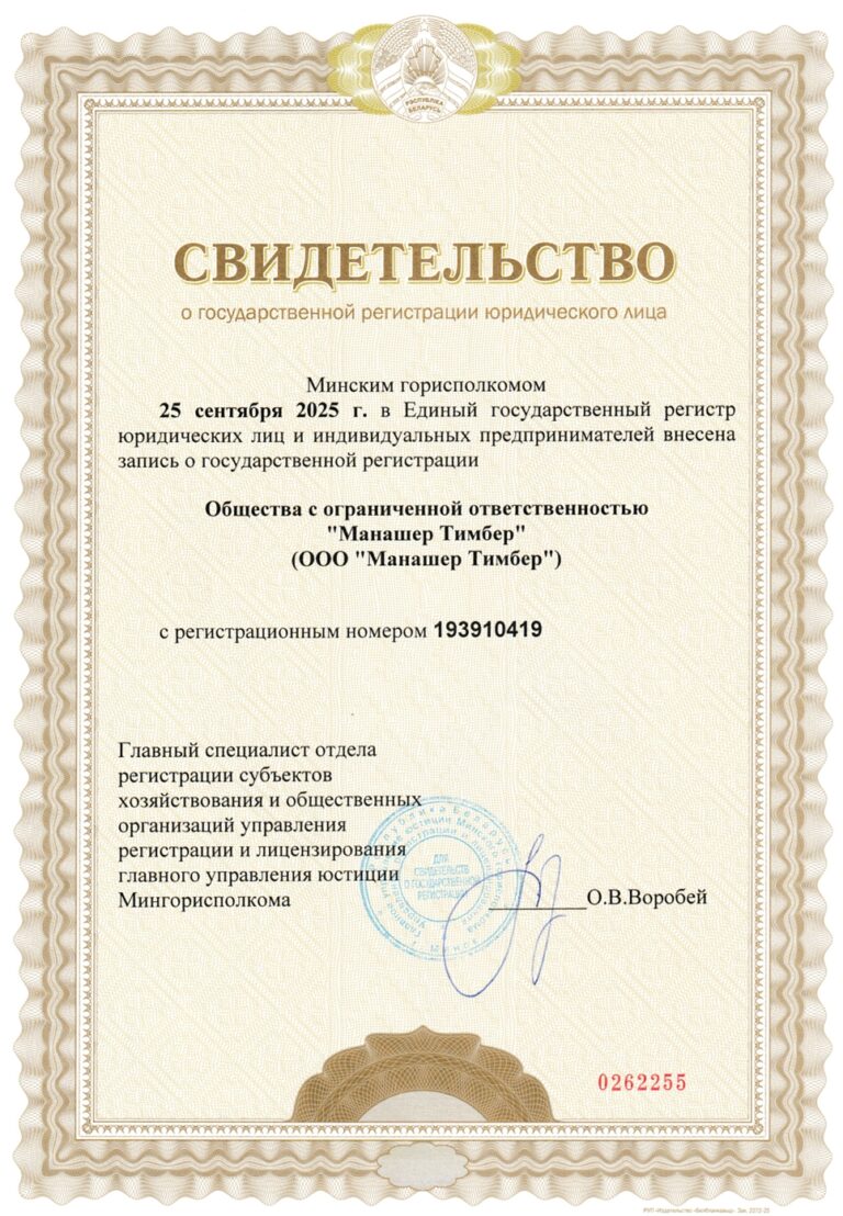 Компания Manasher располагает всеми необходимыми свидетельствами и регистрационными документами, подтверждающими соответствие требованиям законодательства Республики Беларусь и международным торговым стандартам.